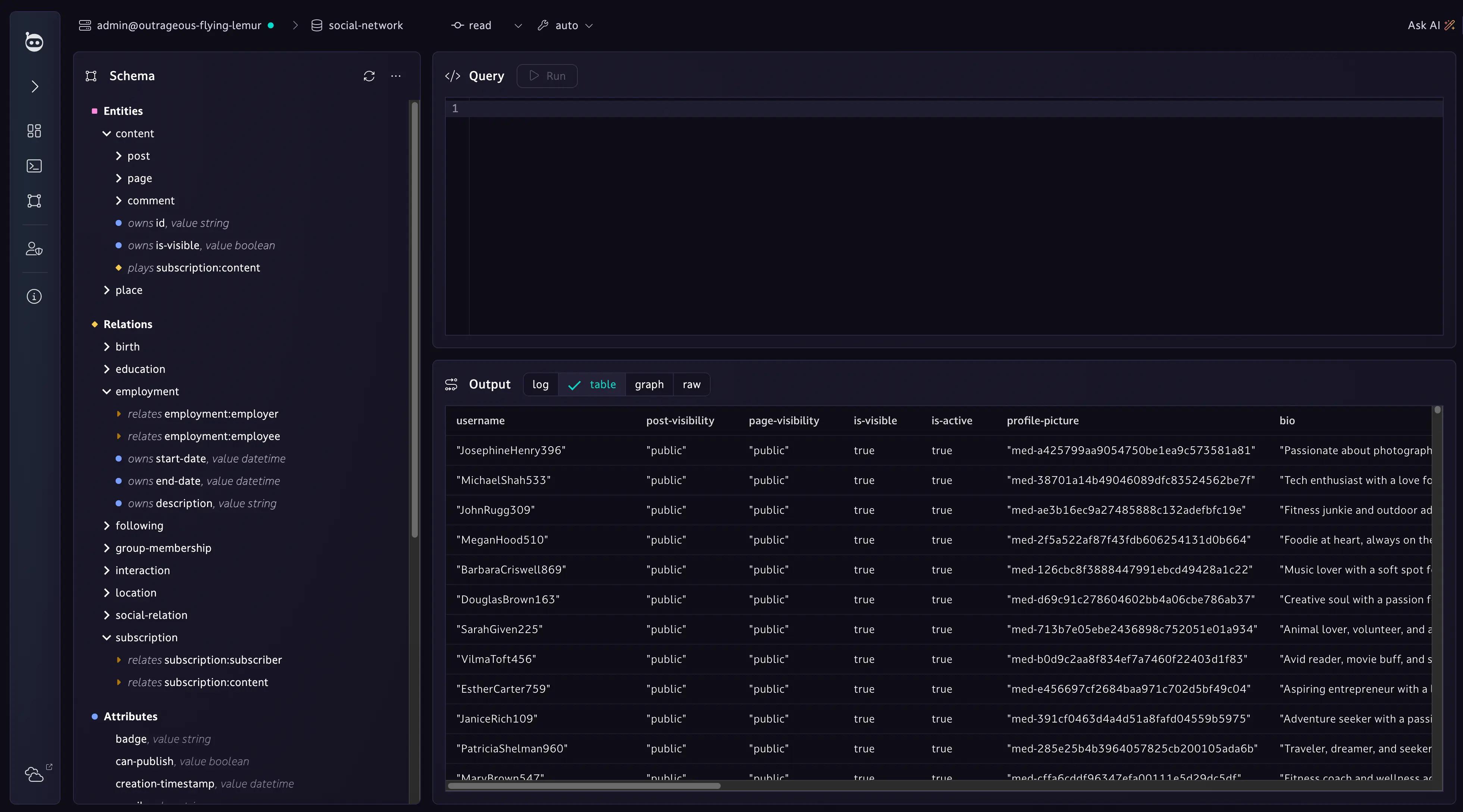 Using the Polymorphic-Entity-Relations-Attribute (PERA) model as the basis of TypeQL leads to a general, expressive, intuitive, and strongly typed language! Since data must be instantiated from the schema, the system can make strong guarantees about data integrity and shape.